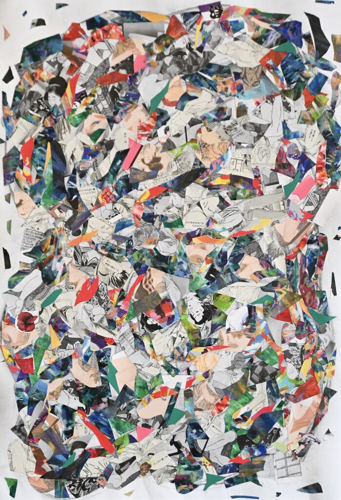 道 / The Path | Mixed media (oil pastel, acrylic, canvas fragments, book pages) | 67 × 46 cm | December 2025