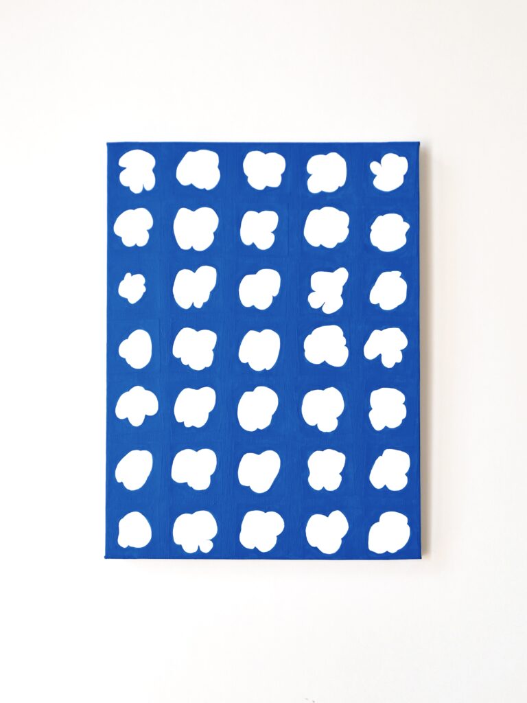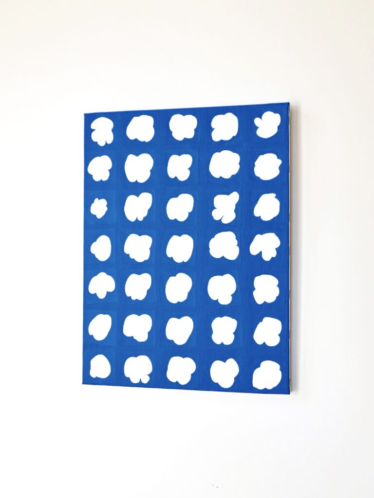 「RATIO(2026–)」は、描画されたドローイングを制作順に一方向へ並べ、その上から塗りを重ねたシリーズ作品です。すべての塗りは手作業で行っており、ひとつひとつの形は決して同一ではありません。形態とその間隔は一定のルールに従って配置され、全体として統合された構造を持っています。